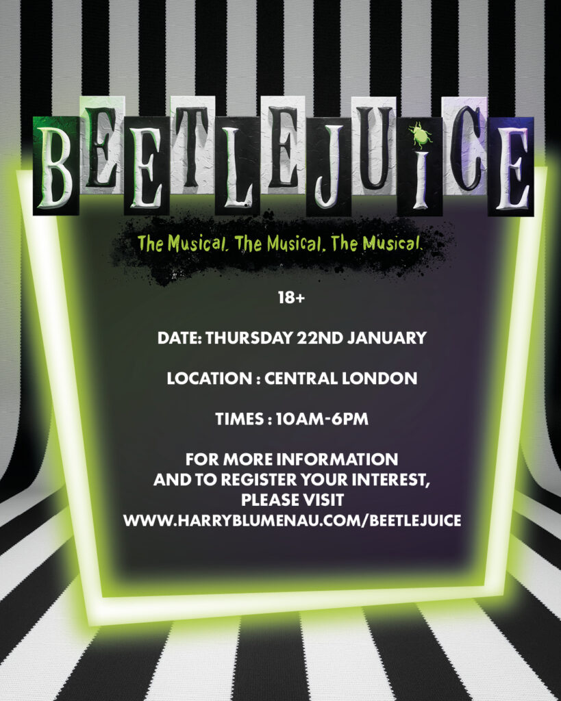 If this could be you, then there’s no need to consult the Handbook For The Recently Deceased. For more information and to register your interest, please visitwww.harryblumenau.com/beetlejuice
