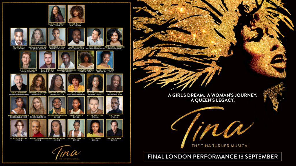 From Tuesday 24 June 2025, Natasha J Barnes joins as the manager of Ike and Tina, Rhonda Graam, Chrissie Bhima joins to playTina’s sister Alline Bullock, James Chisholm joins as Tina’s father Richard Bullock, Matt Dempsey will play record producer Phil Spector and lyricist Terry Britten, Irene Myrtle Forrester continues as Tina’s grandmother, GG, Christian James joins as Tina’s manager Roger Davies,current company member Dan O’Brien will take over the role ofrecord company marketing manager Erwin Bach, Samuel Sarpong-Broni joins the castas Tina’s first love Raymond Hill, Charlotte St. Croix will continue as Standby Tina Turner and Carole Stennett continues as Tina’s mother Zelma.