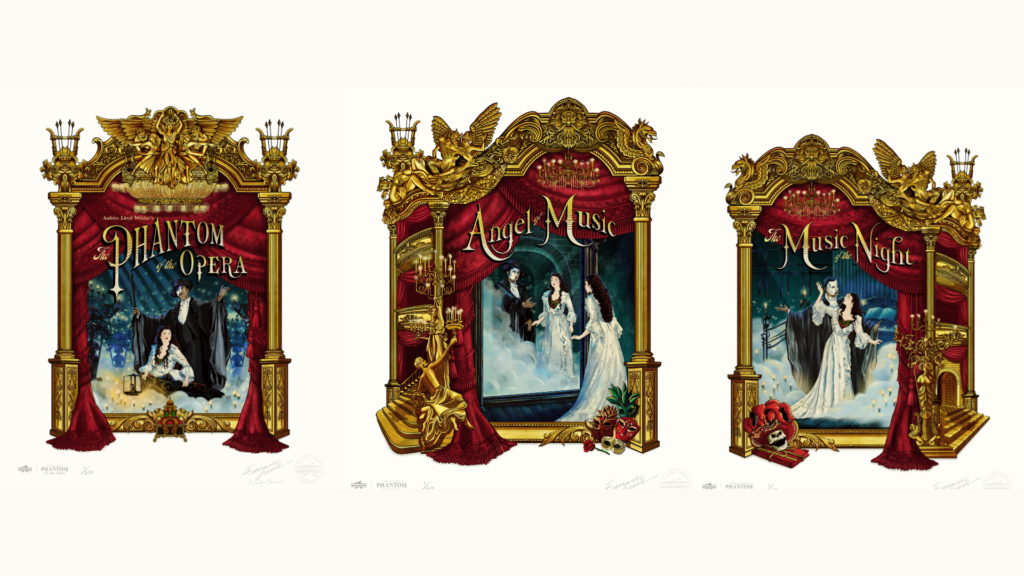 The art prints depict iconic moments, featuring leading characters, The Phantom and Christine Daaé, including three of the best loved songs, ‘The Phantom of the Opera’, ‘Angel of Music’ and ‘The Music of the Night’. Each of the three designs is limited to an edition of 250.